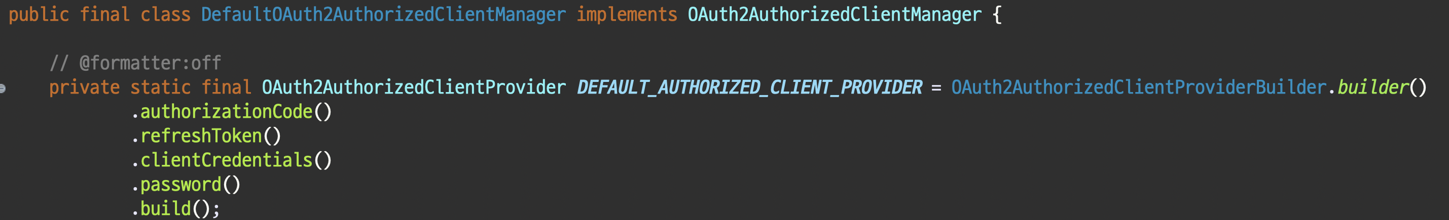 DefaultOAuth2AuthorizedClientManager.class 에서 변수로 OAuth2AuthorizedClientProviderBuilder 를 세팅한다.
